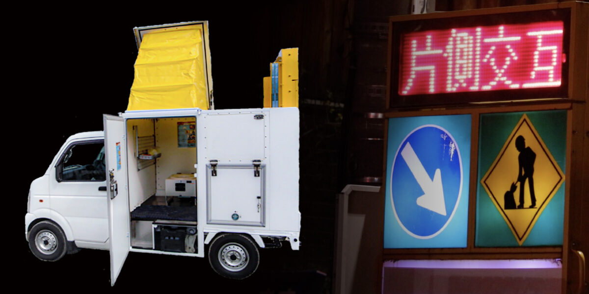 格納庫にはカラーコーン、コーンバー等を積載でき、取り出して規制区域をすばやく確保できます。